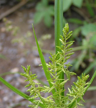 形態(tài)特征:稈叢生,直立,株高20—85cm,扁三棱狀。葉基生,較稈短,葉鞘紅褐色。苞片3—5,葉狀,下部2—3片較花序長;長側枝聚傘花序復出,有4—9條長短不一的輻射枝,每枝具5—10個穗狀花序,個別3個,穗狀花序長卵形,有小穗5—12個;小穗長圓形扁平,具花5—22朵;鱗片寬倒卵形,先端略缺,有短尖,背部有綠色龍骨狀突起,兩側黃色;雄蕊、柱頭各3個。小堅果三棱狀倒卵形,黑褐色??糠N子繁殖。