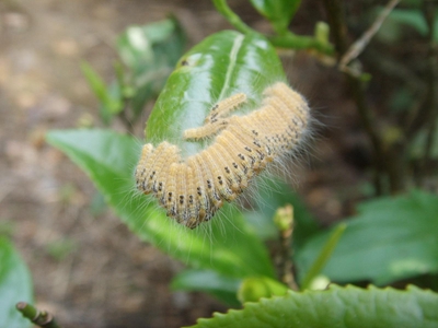 幼蟲(chóng)有群集性,一至三齡幼蟲(chóng)常數(shù)十頭至百余頭聚集在一處,蟲(chóng)體排列整齊。三齡后開(kāi)始擴(kuò)散,遷移時(shí)一頭在前,其余尾隨而行,頭部不時(shí)左右擺動(dòng)。高齡幼蟲(chóng)較敏感,受驚動(dòng)后立刻擺頭,有時(shí)吐黃綠色液體,或假死吐絲墜落后躲藏于茶叢下部葉背或土壤縫隙處,待四周平靜后再恢復(fù)正?;顒?dòng)。幼蟲(chóng)不喜陽(yáng)光直射和高溫。一般早晚在茶叢枝端葉片上咬食,中午常移至茶叢中、下部葉上為害。夏天中午陽(yáng)光強(qiáng)時(shí),常躲在茶叢基部蔭蔽處,停止取食。幼蟲(chóng)6?7齡,每次蛻皮前均成群遷移至葉背、枝干或根頸裂縫等隱蔽處,頭朝內(nèi)尾向外,呈橢圓形排列,并吐絲連接在一起,蛻皮后又成群遷移到鄰近枝葉上為害。幼蟲(chóng)老熟后遷至茶叢根頸部附近土塊縫隙中、枯枝落葉間或表土下少量聚集結(jié)繭化蛹,以枯枝落葉或縫隙中為多,少數(shù)入土化蛹,入土深度為1.5?6.0cm。一般陰暗潮濕的地方化蛹較多。蛹期第一、二和三代歷期分別為10?14d、12?21d和23?31d。