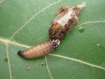 幼蟲共6?7齡。卵多于14:00-15:00孵化。孵化后幼蟲先在囊內(nèi)咬食卵殼,1?2d后自母囊排泄孔爬出,腹部豎起迅速爬至枝葉,或吐絲下垂隨風(fēng)飄散到附近茶叢上,片刻后即開始吐絲和咬取枝葉碎屑營囊護(hù)身,護(hù)囊歷經(jīng)1.5?2. 0h建成,而后開始取食。隨著蟲齡增大護(hù)囊也隨之增大。幼蟲活動(dòng)、取食時(shí),僅頭、胸伸出,用胸足爬行負(fù)囊行進(jìn)。初孵時(shí)護(hù)囊能隨腹部向上豎立,狀如鉚釘,稍大后即腹部下垂,懸掛于枝葉下面。幼蟲取食多在清晨、傍晚和陰天。晴天中午很少取食,常隱藏在茶叢中葉背。幼齡幼蟲取食下表皮和葉肉,留上表皮呈半透明黃褐色斑膜;三齡后咬食葉片成孔洞;四齡后食量大增,能咬食全葉、嫩梢和果皮,并咬取小枝,整齊并列黏綴于囊處。每頭幼蟲食葉量幼齡時(shí)為0.25g,老熟前為24g。幼蟲老熟時(shí)先吐絲封閉囊口,將上端用絲緊附于枝葉上,后將蟲體上下倒轉(zhuǎn),化蛹于囊內(nèi)。