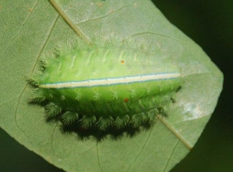 幼蟲:體長(zhǎng)為21?26mm,扁平橢圓形,背部稍隆起,淡綠色,背線灰白。每體節(jié)有4對(duì)綠色枝狀毒刺,其中蟲體兩側(cè)邊緣的1對(duì)較大,亞背線上的1對(duì)較小,中背線灰白色,體背中央兩側(cè)各有1個(gè)紅點(diǎn)。