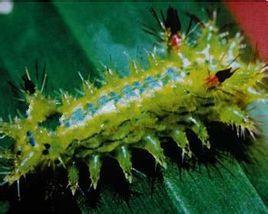 幼蟲:共6齡。體長為20?35mm,長橢圓形,前端略大,背部稍隆起呈屋脊狀,黃綠至灰綠色;體背有11對、體側(cè)有9對突起,突起上著生刺,在體背第二對和第三對突起間有1個綠色或紫紅色的肉質(zhì)角狀大突起,伸向上前方,體背中部和后部還各有1個紫紅色斑紋。背線藍綠色,體側(cè)沿氣門線有1列紅點。低齡幼蟲無角狀突起和紅斑,體背前部3對刺、中部1對刺、后部2對刺較長(黃安平等,2009)。