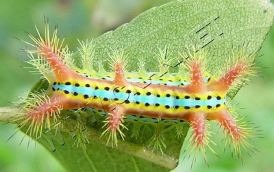 以幼蟲咬食葉片為害,體上刺毛觸及人體皮膚引起紅腫癢痛,嚴(yán)重時發(fā)生皮炎,影響茶葉產(chǎn)量和茶園管理。雌蛾產(chǎn)卵于葉背,幼蟲孵化后在葉背群集并取食葉肉,半月后分散為害,取食葉片。低齡幼蟲咬食下表皮和葉肉,成長后自葉尖咬食葉片成平直缺口,如刀切,嚴(yán)重時僅殘留表皮和葉脈。