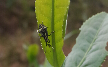 茶麗紋象甲(Myllocerinus aurolineaUus Voss)又稱茶葉象甲、茶小綠象甲,屬鞘翅目象甲科。在全國均有分布,主要分布在江南茶區(qū),以浙江、江蘇、安徽、江西、福建、四川、湖南、湖北、廣東、廣西、云南等省份發(fā)生較嚴(yán)重。該蟲主要以成蟲為害綠茶區(qū)的夏茶,也為害烏龍茶區(qū)的春茶,咀食茶樹葉片使嫩葉形成不規(guī)則弧形缺刻,嚴(yán)重時僅留主脈,為害中度的達(dá)20%左右,嚴(yán)重的達(dá)50%以上。食性雜,除為害茶樹外,還為害梨、杏、桃、李、柑橘、蘋果、油茶、山茶、洋槐、板栗、芝麻、辣蓼、甘薯、油桐、金剛刺以及豆類綠肥等。