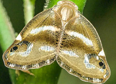 成蟲:體長(zhǎng)為7?9mm,翅展為11?15mm。體褐色至深褐色,以中胸背板色最深,腹面色淺,后翅色淡,前翅油狀光澤明顯。額具中脊,無(wú)側(cè)脊,前胸背板具中脊,兩邊有刻點(diǎn);中胸背板具中脊3條,中脊長(zhǎng)而直,側(cè)脊從中部向前分叉,二內(nèi)叉內(nèi)斜,端部互相靠近,外叉短,基部斷開。前翅廣闊,外緣和內(nèi)緣長(zhǎng)度相等;前緣的橫脈域和外緣整齊排列的端室連成一寬帶,并略呈波狀;前緣近端部2/5處有一長(zhǎng)三角形透明斑,近頂角有一黑褐色隆起眼斑;內(nèi)橫帶透明,寬而略呈弧形,前端不到前緣的橫脈域;外橫帶由2條透明的短橫帶組成,其前帶的末端向內(nèi)伸岀一小叉;內(nèi)外橫帶之間近頂角處有一黑褐色隆起的眼斑。后翅翅脈色深,二橫帶均無(wú)色透明,帶上的脈紋白色;翅后緣有無(wú)色透明縱條。后足脛節(jié)外側(cè)具2個(gè)大刺和1個(gè)極小的刺。