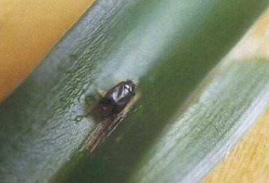 成蟲:長卵圓形,扁平,綠色,長為5?5.5 mm,寬約2.5 mm。頭寬短;復眼黑褐色;觸角線形,淡褐色,4節(jié),第二節(jié)最長,基兩節(jié)黃綠色,端兩節(jié)黑褐色。前胸背板深綠色,密布刻點。小盾片三角形,微突,黃綠色。前翅革片為綠色,革片端部與楔片相接處略呈灰褐色;楔片綠色,膜區(qū)暗褐色。足黃綠色,股節(jié)膨大,后足股節(jié)末端具褐色環(huán)斑,脛節(jié)有刺。