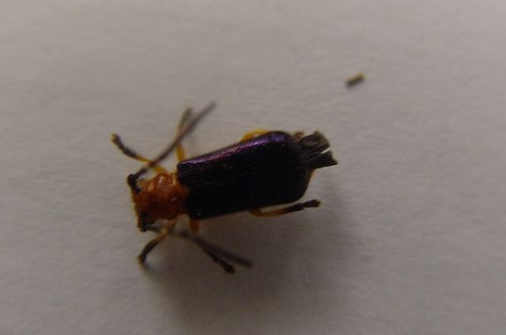 成蟲:體長為9?11mm。頭、前胸背板及小盾片絳紅色,前胸背板中部有1疣突。觸角柄節(jié)絳紅色,第三、四節(jié)基部橙黃色,其余皆為黑色。復眼黑色。鞘翅藍色帶紫色光澤,散生粗刻點。腹面橙黃色。各足跗節(jié)及脛節(jié)端部1/3?2/3黑色,其余橙黃色。全體多毛。