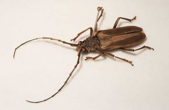成蟲:體長(zhǎng)約30mm,暗褐色,有光澤,生有褐色密短毛。頭頂中央具1條縱脊。復(fù)眼黑色,兩復(fù)眼在頭頂幾乎相接。復(fù)眼后方具1短且淺的溝。觸角中、上部各節(jié)端部向外突并生1小刺。雌蟲觸角與體長(zhǎng)近似;雄蟲觸角為體長(zhǎng)近2倍。前胸寬大于長(zhǎng),前端略狹,中部膨大,兩側(cè)近弧形,背面具皺,小盾片末端鈍圓;鞘翅上具淺褐色密集的絹絲狀絨毛,絨毛具光澤,排列成不規(guī)則方形,似花紋。