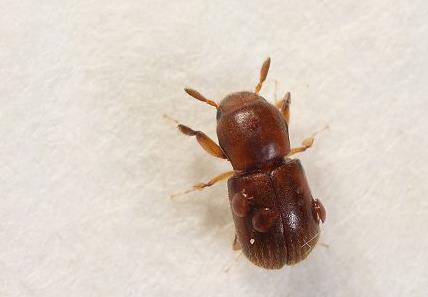 成蟲(chóng):圓筒形,體長(zhǎng)為2.0?2.4mm,褐至黑褐色,有光澤。頭半球形,位于前胸下,觸角短錘形,彎曲。前胸發(fā)達(dá),背板寬略大于長(zhǎng),前部多粒突。鞘翅長(zhǎng)為前胸長(zhǎng)的1.6倍,兩側(cè)緣前3/4平行,后1/4 作弧形后收。翅面溝淺,刻點(diǎn)較密,各溝縱列刻點(diǎn)上有一絨毛。前足脛節(jié)外側(cè)齒狀。
