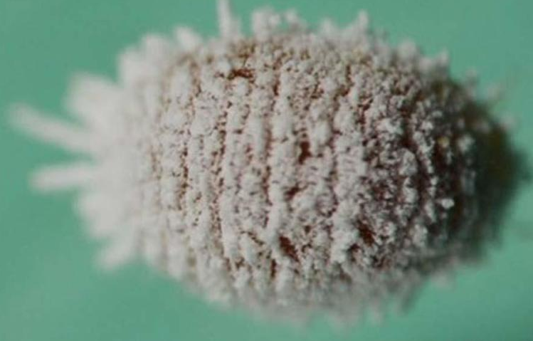 雌蟲:體呈橢圓形,體外被白色蠟質(zhì)分泌物覆蓋。體長2.5?4.5mm,寬1.5?2.0mm。觸角細(xì)索狀,著生在頭部頂端腹面兩側(cè)邊緣,共8節(jié),第一節(jié)粗短,第四節(jié)近似念珠狀,為整個觸角最短的節(jié),第八節(jié)最長。每節(jié)均生有數(shù)根細(xì)毛,第八節(jié)細(xì)毛明顯多于其他節(jié)。喙位于前足的中間,即胸部第一節(jié)??卺?條,里面2條較細(xì),另外2條較粗,包在其外。這4條口針細(xì)長而硬,長度可達(dá)蟲體的長度,卷曲藏于中、后胸間的特殊口袋中。體側(cè)有17對刺孔群,在蟲體的背面分布著許多長短、粗細(xì)不一的體毛。3對胸足著生于3個胸節(jié)上,每足由6節(jié)組成,且每節(jié)均生有數(shù)根細(xì)毛。在前足和中足下方各有1對喇叭狀氣門,分別為前胸氣門和后胸氣門。背部具有前背裂和后背裂,如橫裂的唇狀。在腹面第四至五節(jié)間有1明顯腹裂。尾端有2根顯著伸長的臀瓣刺,肛門位于腹部最后一節(jié),肛環(huán)呈圓形,在肛環(huán)上有1列卵圓形的肛環(huán)孔和6根肛環(huán)刺。