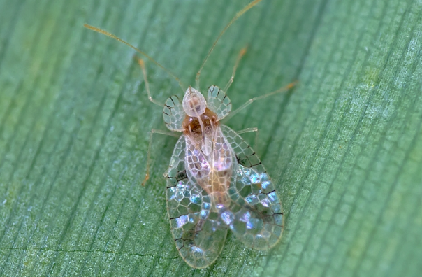 成蟲(chóng):體長(zhǎng)2.1?2.4mm,剛羽化時(shí)呈銀白色,后逐漸轉(zhuǎn)變?yōu)榛野咨?。頭小,棕褐色,復(fù)眼大而突出,黑褐色。觸角4節(jié),第三節(jié)細(xì)長(zhǎng),約為全長(zhǎng)的1/2,末節(jié)稍膨大,棕褐色。具刺吸式口器,喙4節(jié),末端黑色,伸達(dá)后足基節(jié)間。在前胸背板兩側(cè)及頭頂部分有一塊白色突出膜,上具網(wǎng)狀紋,形狀特異,似“花冠”,側(cè)背板呈翼狀擴(kuò)展,并向上翹起,前部形成囊狀頭兜,前尖后圓,覆蓋頭部,后部與三角突的壁狀中脊相連接,兩側(cè)為小翼狀的側(cè)脊。胸部腹板的中央兩側(cè)隆起,中央呈槽狀,前窄后寬,喙置于槽中。足細(xì)長(zhǎng),跗節(jié)1節(jié),末端具2爪。前翅膜質(zhì),近透明,長(zhǎng)橢圓形,基部窄,端部寬圓,凹凸不平,膜質(zhì)透明,具網(wǎng)狀紋,翅基及近端 部有黑色橫斑,翅緣具毛,前翅遠(yuǎn)超過(guò)腹末;后翅狹長(zhǎng),無(wú)網(wǎng)紋,僅達(dá)腹末,寬約為前翅的1/3,無(wú)網(wǎng)紋,有毛。雌蟲(chóng)腹部可見(jiàn)8節(jié),末端錐形,產(chǎn)卵器明顯;雄蟲(chóng)腹部瘦長(zhǎng),可見(jiàn)7節(jié),腹末平截,具1對(duì)鐮刀狀抱器。