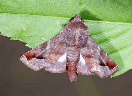 成蟲:體長9?11mm,翅展19?23mm。頭部棕褐色,額區(qū)白色,下唇須前伸,黑色,末端灰白色。雄蛾觸角基部櫛齒狀,約占觸角全長的1/2,端部絲狀。雌蛾觸角絲狀。體背面黑褐色,胸、腹交界處有一白色“八”字形紋。腹面灰白色,腹部各節(jié)兩側(cè)均有1個白色小斑點(diǎn)。前翅茶褐色,基橫線以內(nèi)黑褐色,猶如一個黑褐色的大三角形;后翅灰褐色,外緣黑色,近臀角有一白色短橫紋。