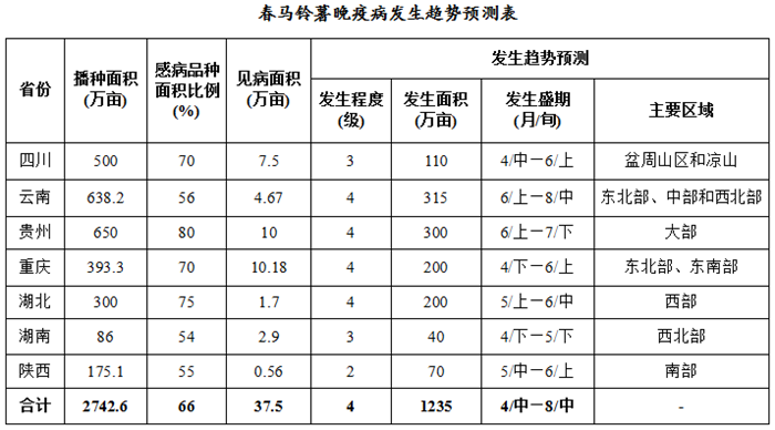 據(jù)氣象部門預(yù)報,今年春季西南及武陵山區(qū)馬鈴薯產(chǎn)區(qū)大部氣溫比常年同期偏高,4月份,湖南、四川西部、貴州東部等地降水較常年同期偏多;且馬鈴薯種植區(qū)多為山區(qū)和丘陵地區(qū),多霧多露,有利于馬鈴薯晚疫病發(fā)生。