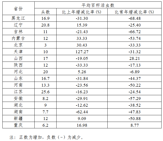 據春季各地剝稈調查,大部地區(qū)玉米螟冬后蟲源基數(shù)比常年和上年偏低,延續(xù)了近年來發(fā)生基數(shù)逐年下降的趨勢。平均百桿活蟲數(shù),江蘇、遼寧、河北分別為25.6頭、20.8頭、20頭,黑龍江、吉林、內蒙古、天津、山西、陜西、山東、河南為10—20頭,其他省份10頭以下(見表1)。