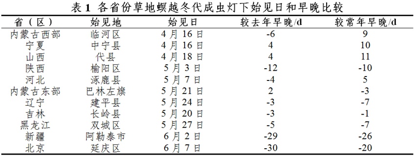 自4月中旬至6月上旬,西北、華北和東北地區(qū)10個省份燈下陸續(xù)始見越冬代成蟲,不同區(qū)域之間始見期相差1個月以上。其中,內(nèi)蒙古西部、寧夏、山西北部、陜西北部、河北北部等核心越冬區(qū)始見期為4月中旬至5月上旬,遼寧、吉林、黑龍江、新疆北疆和北京始見期為5月下旬至6月初。與去年同期相比,寧夏、山西偏早4天,其他大部地區(qū)偏晚4—30天;與常年同期相比,內(nèi)蒙古西部以及寧夏、山西和河北的北部偏早5—11天,其他大部地區(qū)偏晚1—26天(詳見表1)。