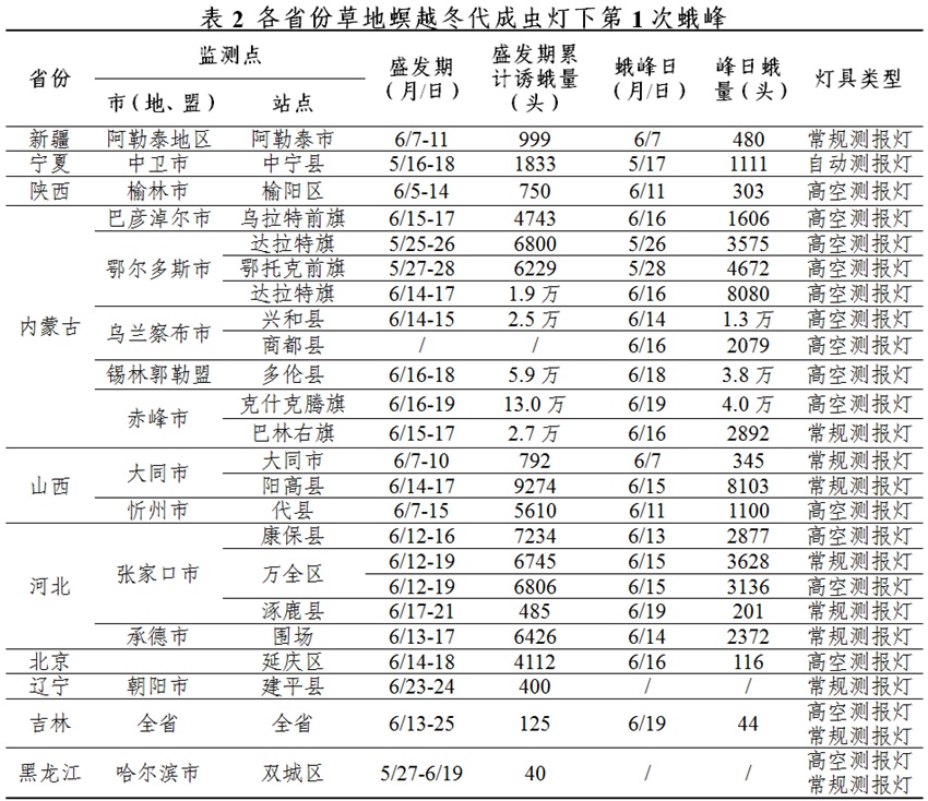 5月中下旬寧夏、內(nèi)蒙古西部,6月上中旬內(nèi)蒙古、河北、山西、北京、陜西、新疆等西北華北地區(qū)出現(xiàn)燈下蛾峰。其中,內(nèi)蒙古、河北、山西等地14個監(jiān)測點(diǎn)出現(xiàn)單燈單日千頭以上蛾峰,內(nèi)蒙古達(dá)拉特旗、山西陽高達(dá)8000頭,內(nèi)蒙古興和、多倫、克什克騰旗達(dá)1萬—4萬頭(詳見表2)。